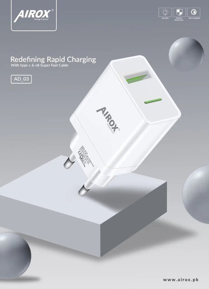 The AD03 20W Fast Charging Adapter is designed to deliver efficient, high-speed charging while keeping your devices fully protected. Built with advanced Power Delivery (PD) technology, it ensures your smartphones, tablets, and other USB-C devices receive the ideal charge without overheating or power fluctuation. Its compact, travel-friendly design makes it perfect for both home and office use.