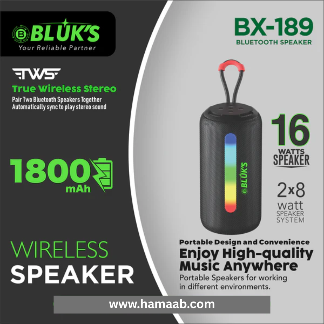 At Hamaab, we bring you audio devices that combine power, style & portability. The BLUK'S BX-189 Portable Wireless Bluetooth Speaker with 1800mAh battery & 16W output is designed to give you uninterrupted music, premium sound quality & reliable performance anytime, anywhere.