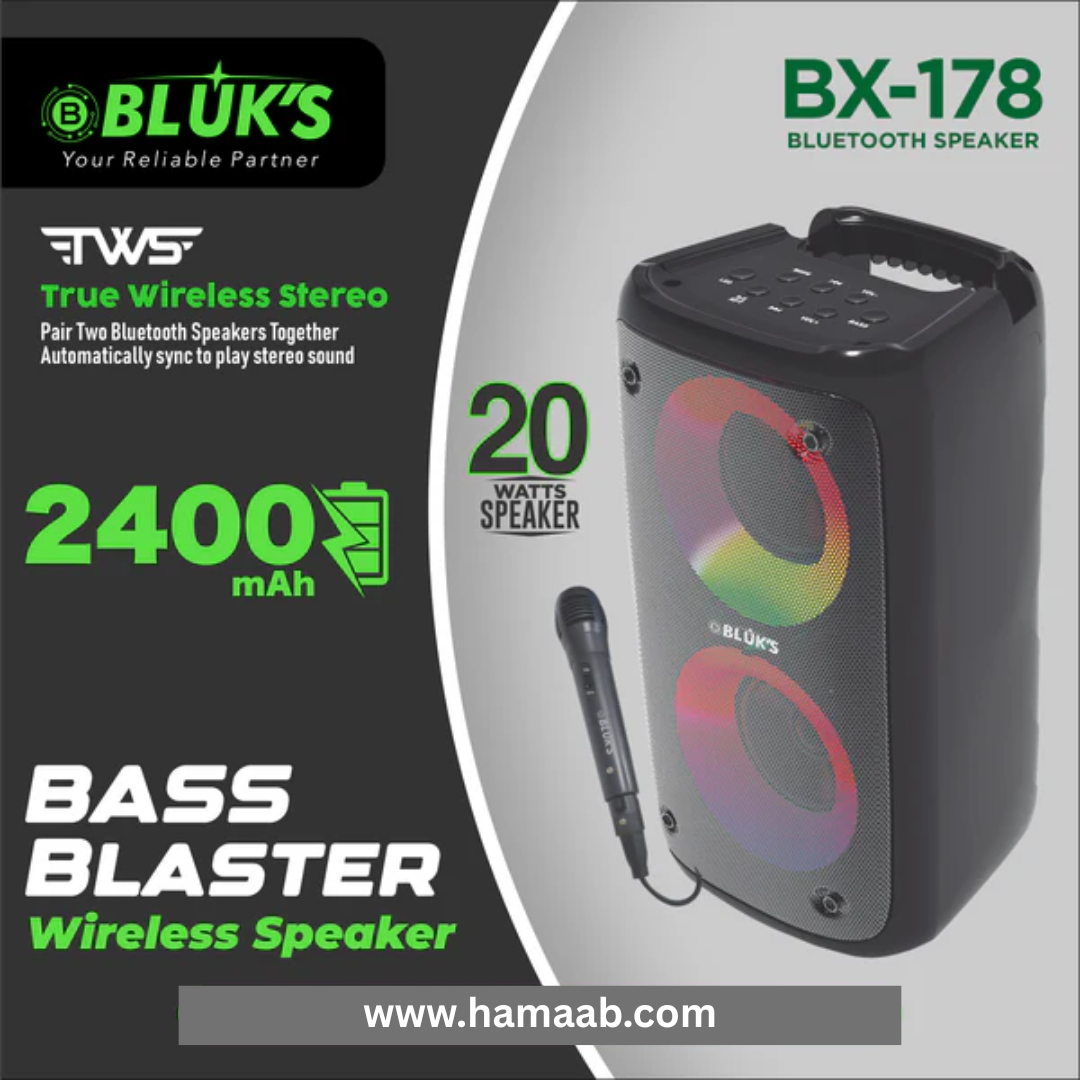 Turn up the volume and feel the beat with the BX-178 Bass Blaster Wireless Bluetooth Speaker, available exclusively at Hamaab. Designed for true music enthusiasts, this speaker delivers exceptional bass, crisp treble, and clear mids — all packed into a sleek, portable design.