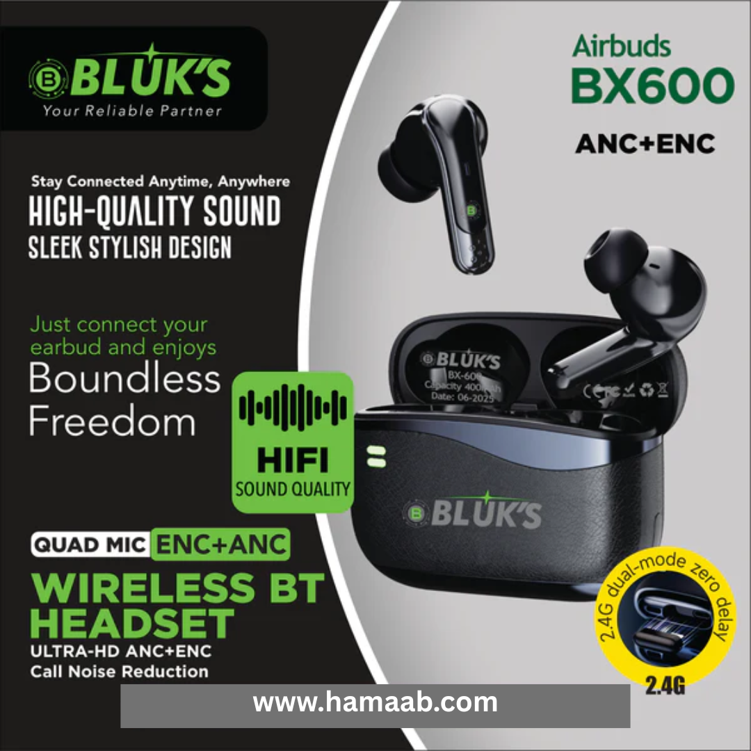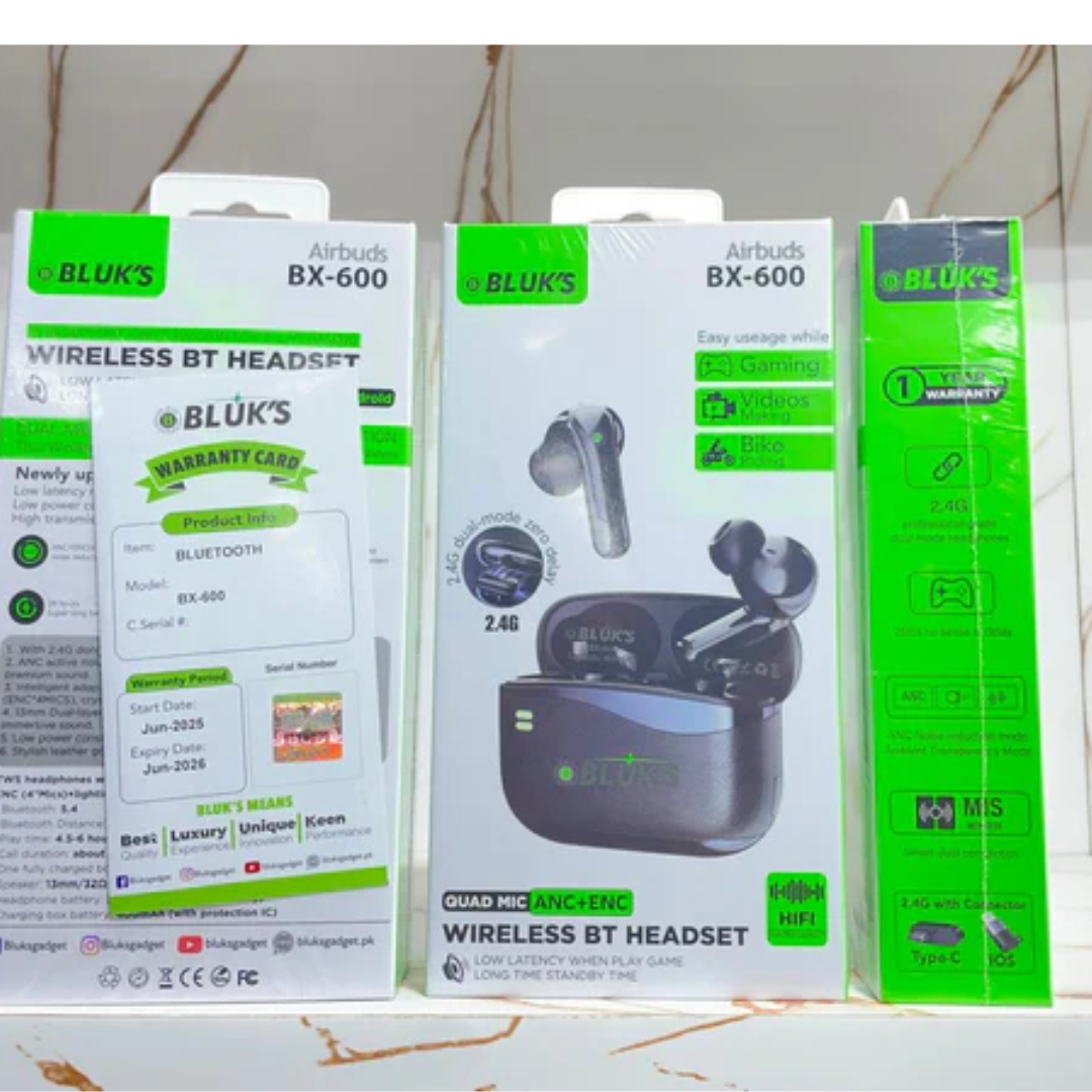 Take your gaming and music experience to the next level with the BLUK’S BX-600 AirBuds – Quad Mic ANC + ENC Gaming TWS with 2.4G Dongle. These advanced true wireless earbuds combine high-fidelity sound, ultra-low latency, and intelligent noise cancellation — built for gamers and audiophiles who demand perfection.